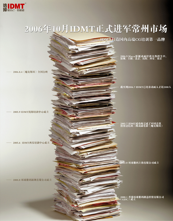 环球数码媒体科技(上海)有限公司(Institute of Digital Media Technology (Shanghai) Limited,简称IDMT)是由总部位于香港的环球数码创意控股有限公司(Global Digital Creations Holdings Limited,简称GDC)于2003年8月在中国大陆创办的全资子公司.IDMT以人为本,立足亚洲,放眼全球,时刻关注产业经济的发展;以上海为中心,辐射长三角及华东、华南地区,致力于为中国数码内容产业培养更多的CG专业人才,为民族数码科技产业发展奠定坚实的基础。